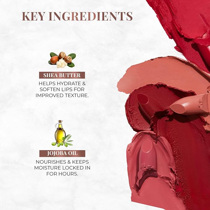 | Product Benefits | NOURISHING FORMULA – Formulated with nourishing, wholesome ingredients, this ultra-matte bullet lipstick hydrates your lips and keeps them feeling soft and supple throughout the day.NOURISHING FORMULA – Formulated with nourishing, wholesome ingredients, this ultra-matte bullet lipstick hydrates your lips and keeps them feeling soft and supp… See more |