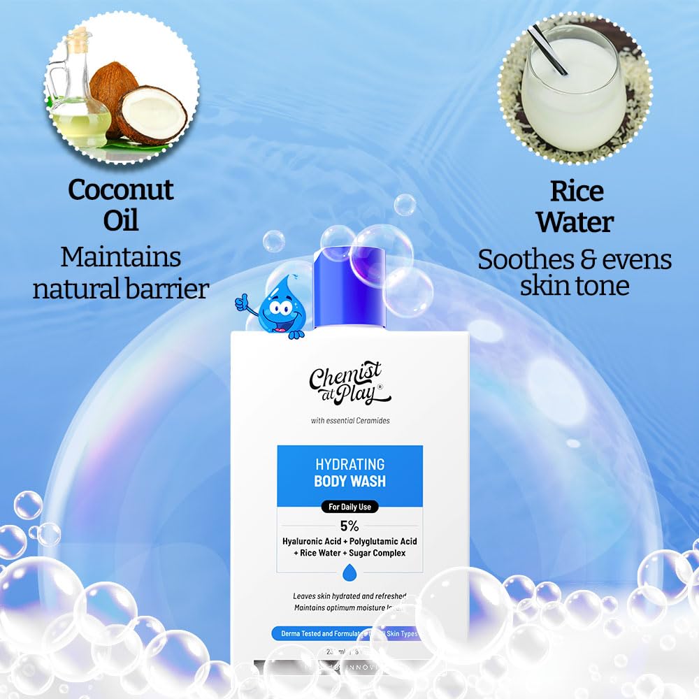 Chemist At Play Hydrating Body Wash | With 5% Hyaluronic Acid Bodywash For Intense Hydration | Reduces Flakes & Itchiness | For Dry Skin | Polyglutamic Acid & Hyaluronic Acid | For Women & Men | 236ml